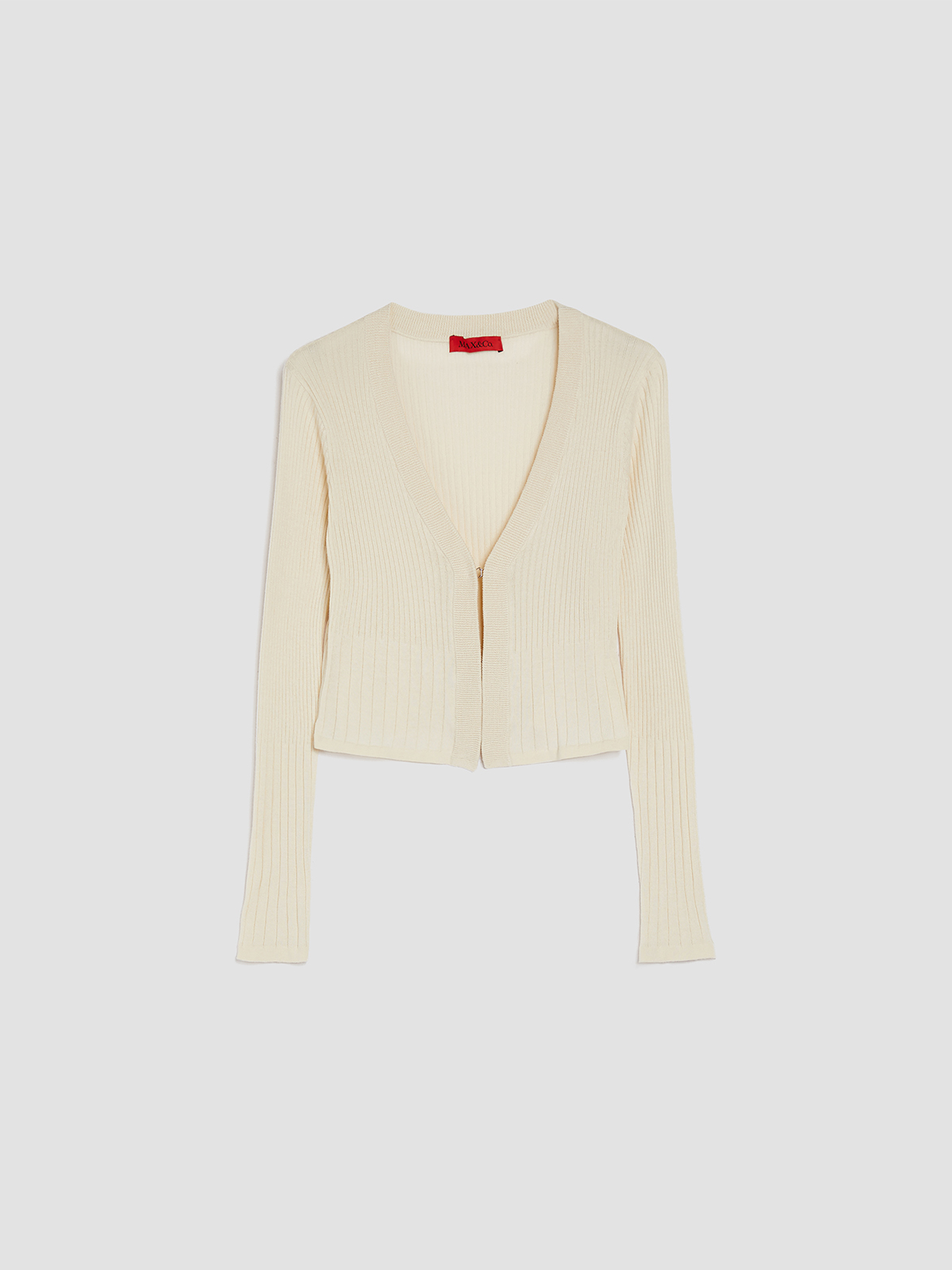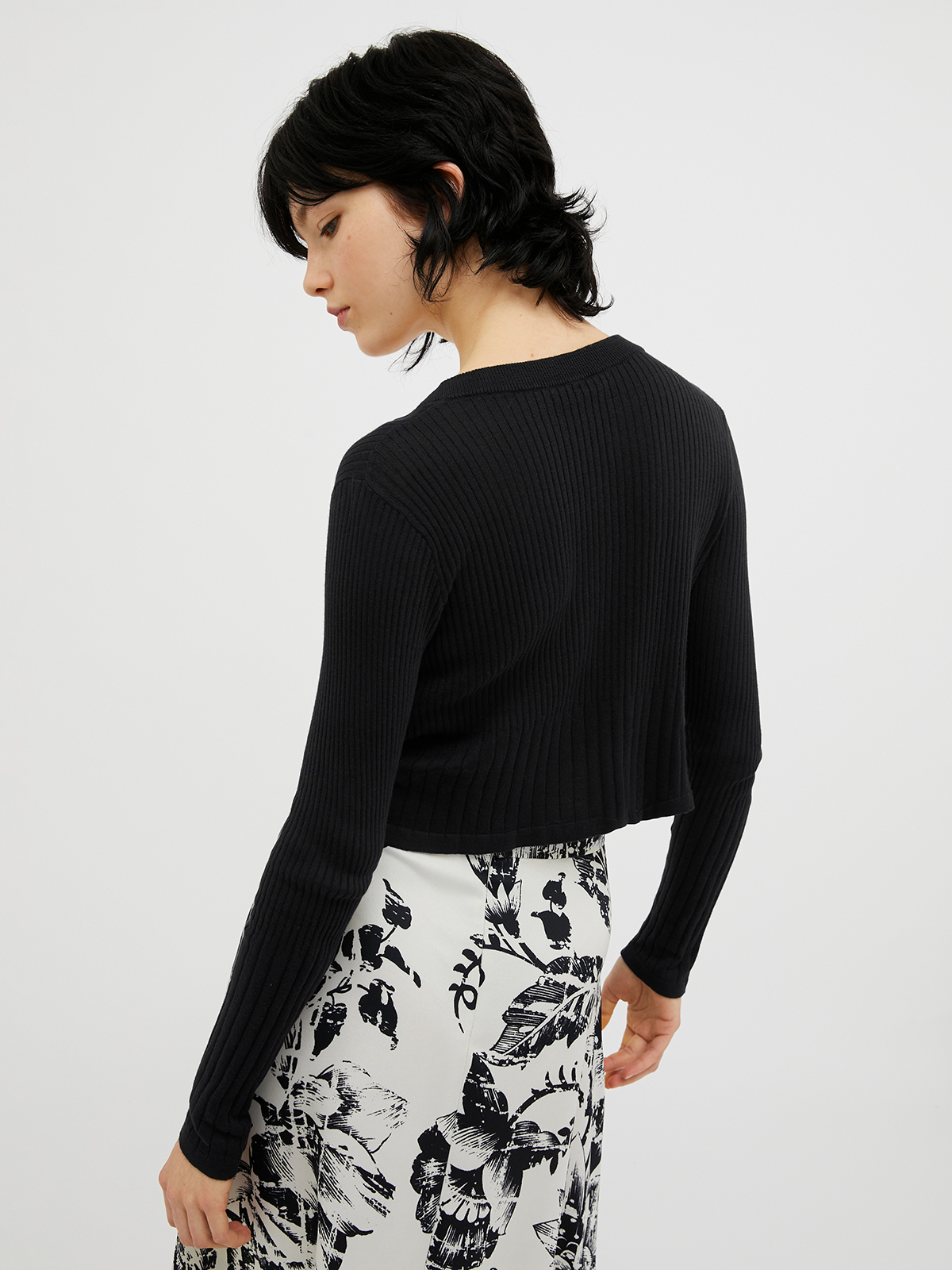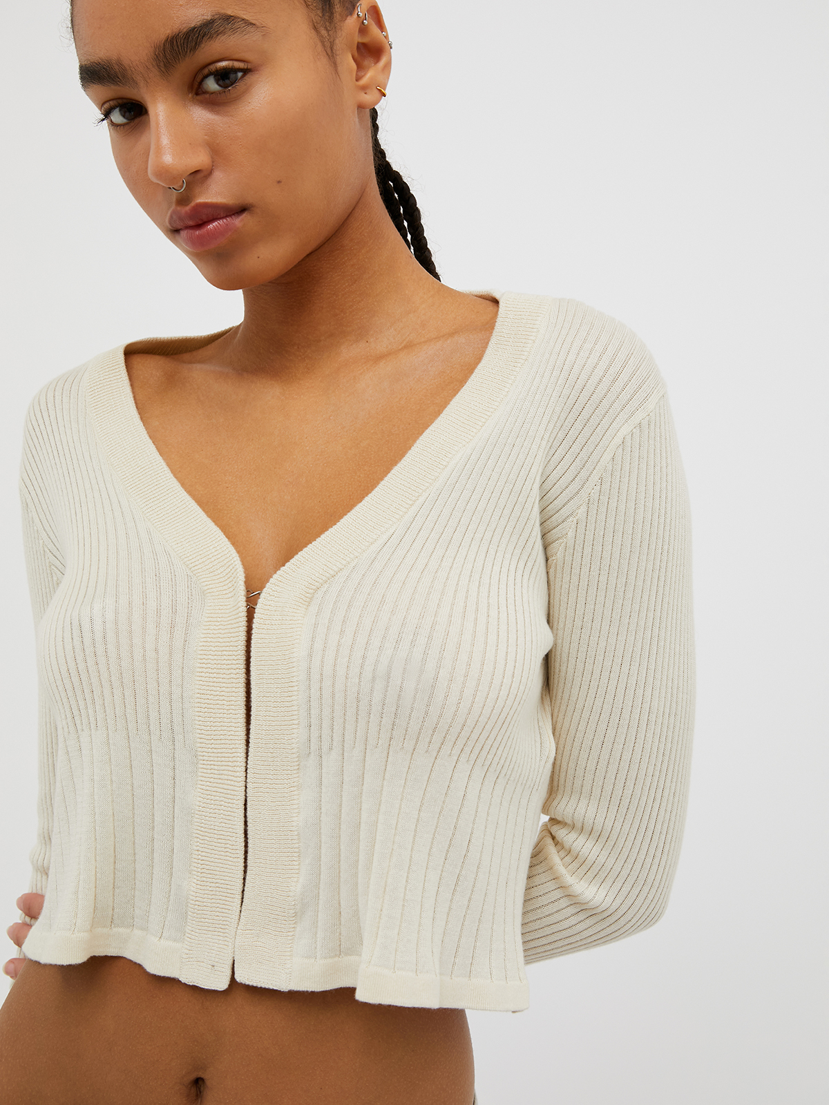 すっきりとしたクロップドレングスに仕上げたカーディガン。