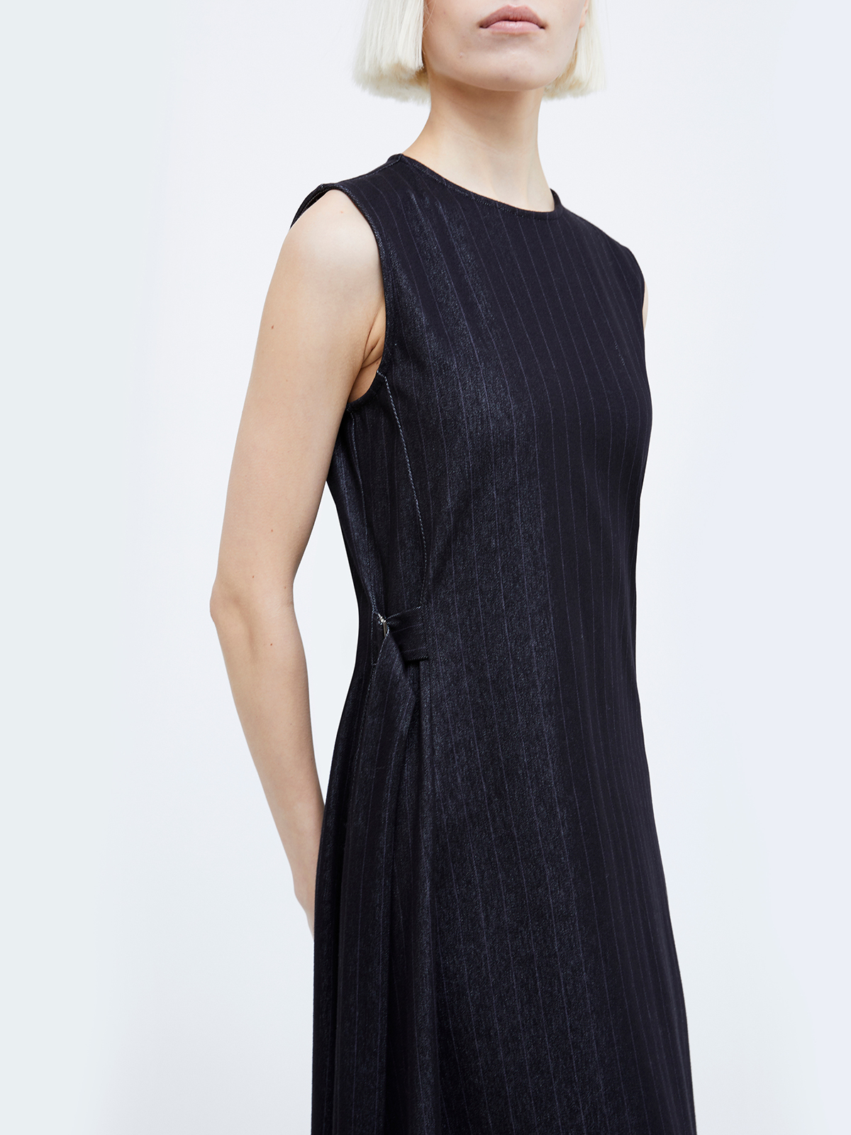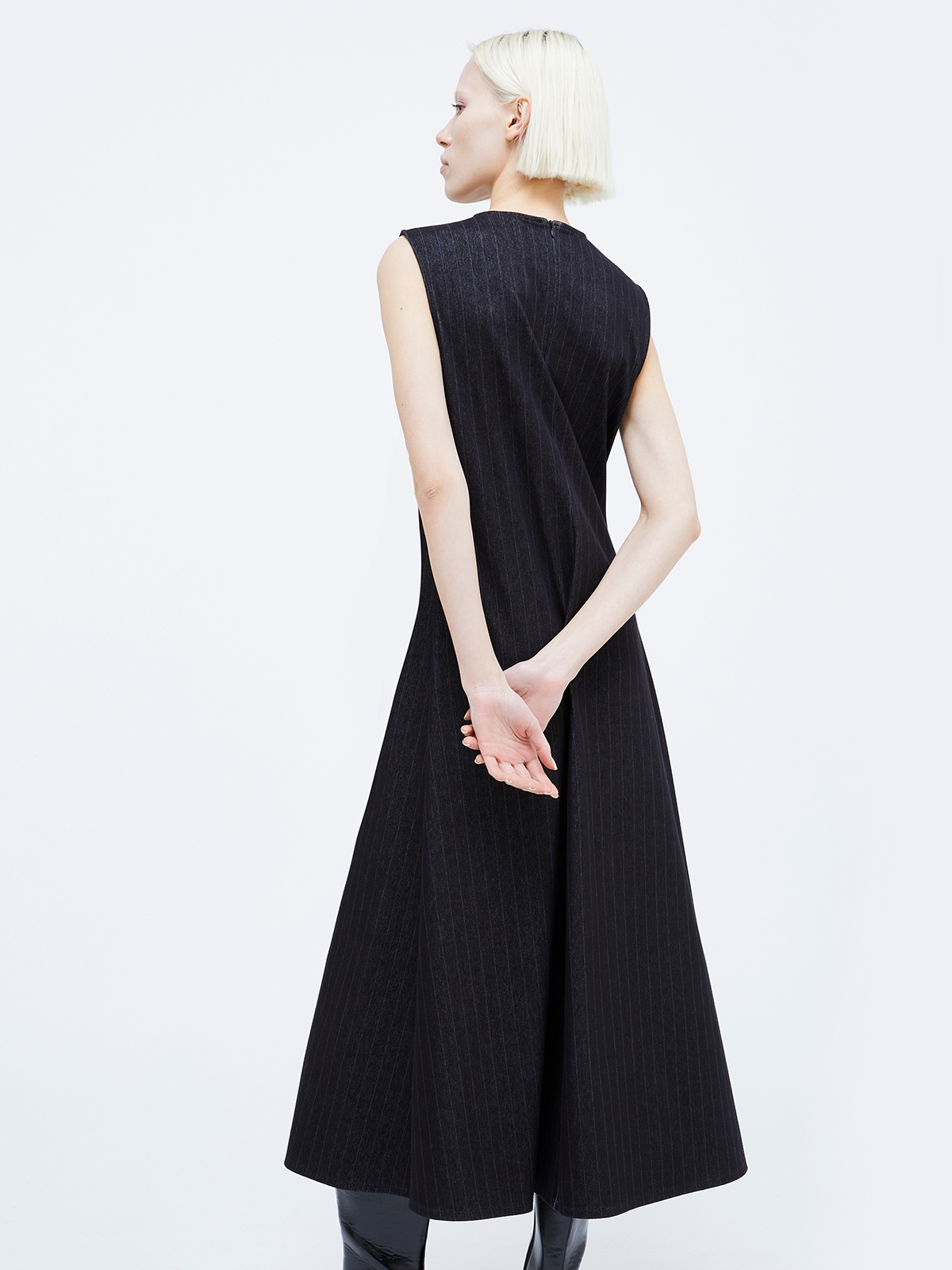 ラウンドネックにスリーブレスのフィット感のあるトップに、裾に向けてエレガントに広がるフレアラインのミディレングス。