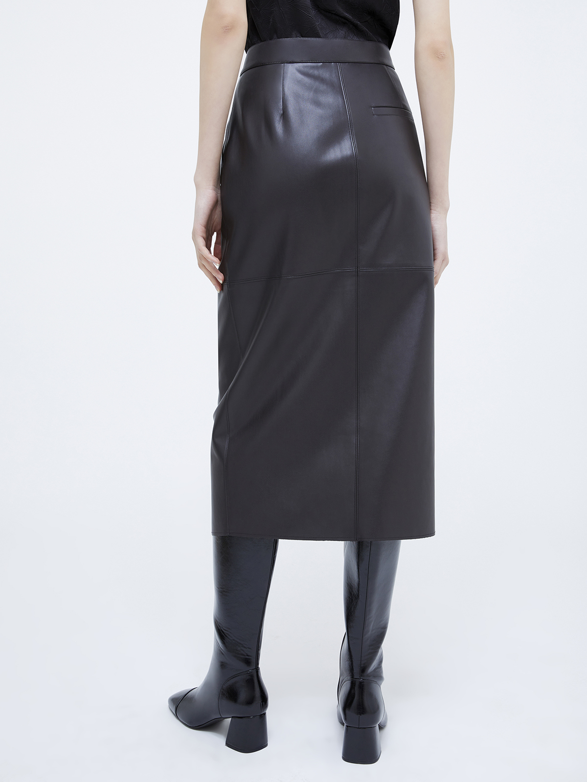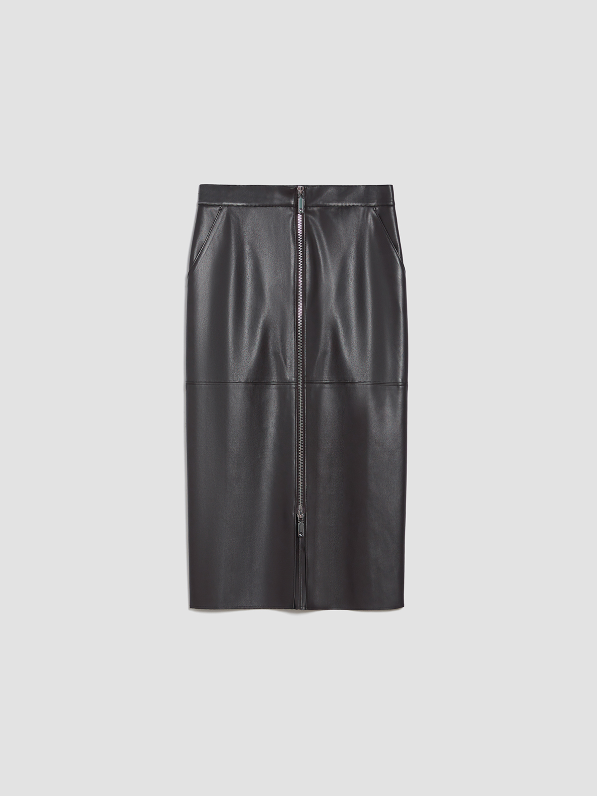コーティング加工を施したジャージー素材を使用したミディスカート。 内側には毛足のあるプラッシュ素材を使用し、軽やかさと暖かさを兼ね備えコンフォートな着用感です。 シルエットは、レギュラーウエストのスリムフィットのペンシルライン。 フロントのメタルジッパーでスリットの深さが調整可能です。 <ポケット>サイドポケット、バックに玉縁ポケット <スタイル>フロントファスナー仕様
