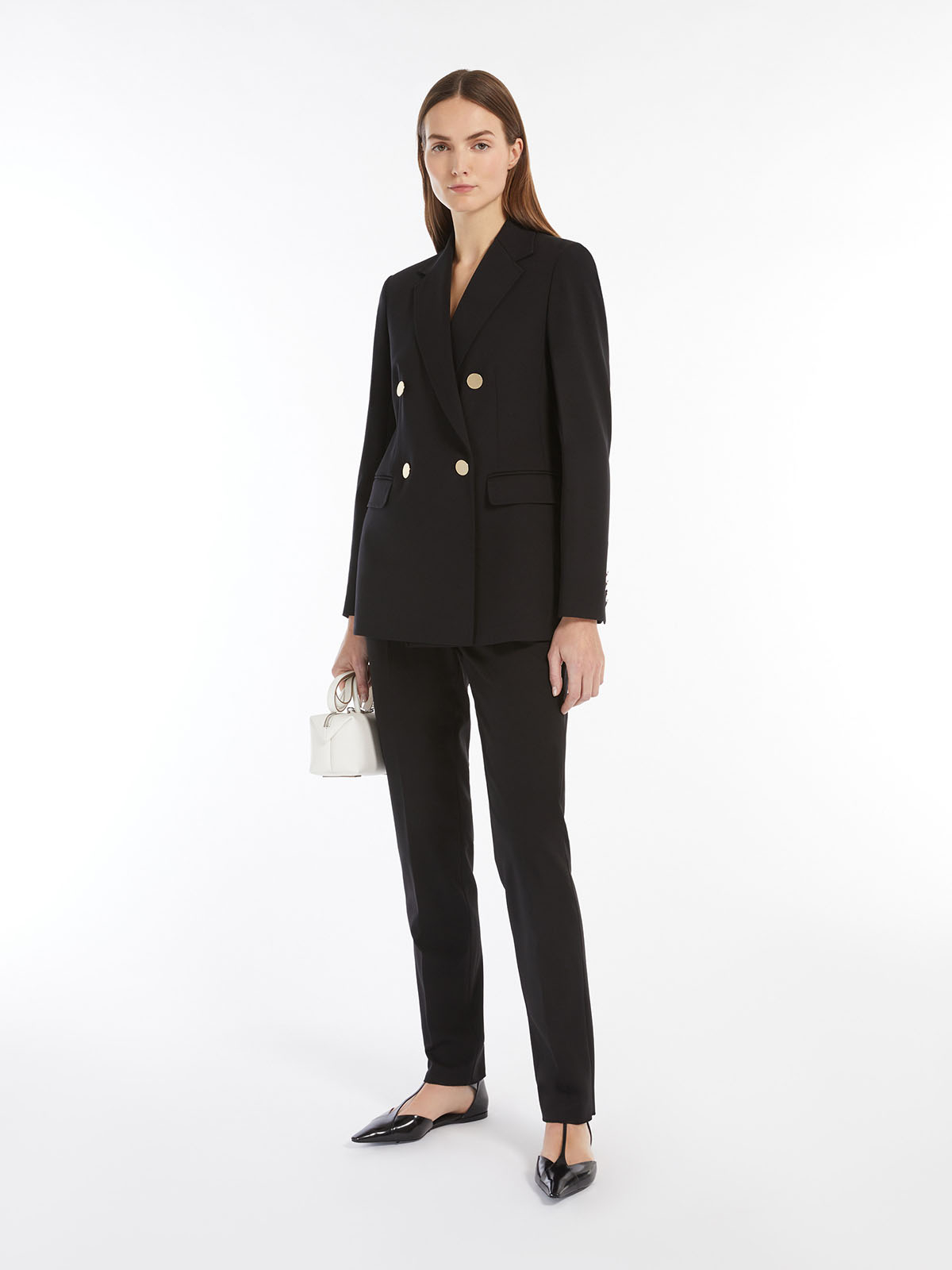 シルエットはラペルカラーのダブルブレスト。程よくウエストラインにフィットし、フェミニンな印象に。
