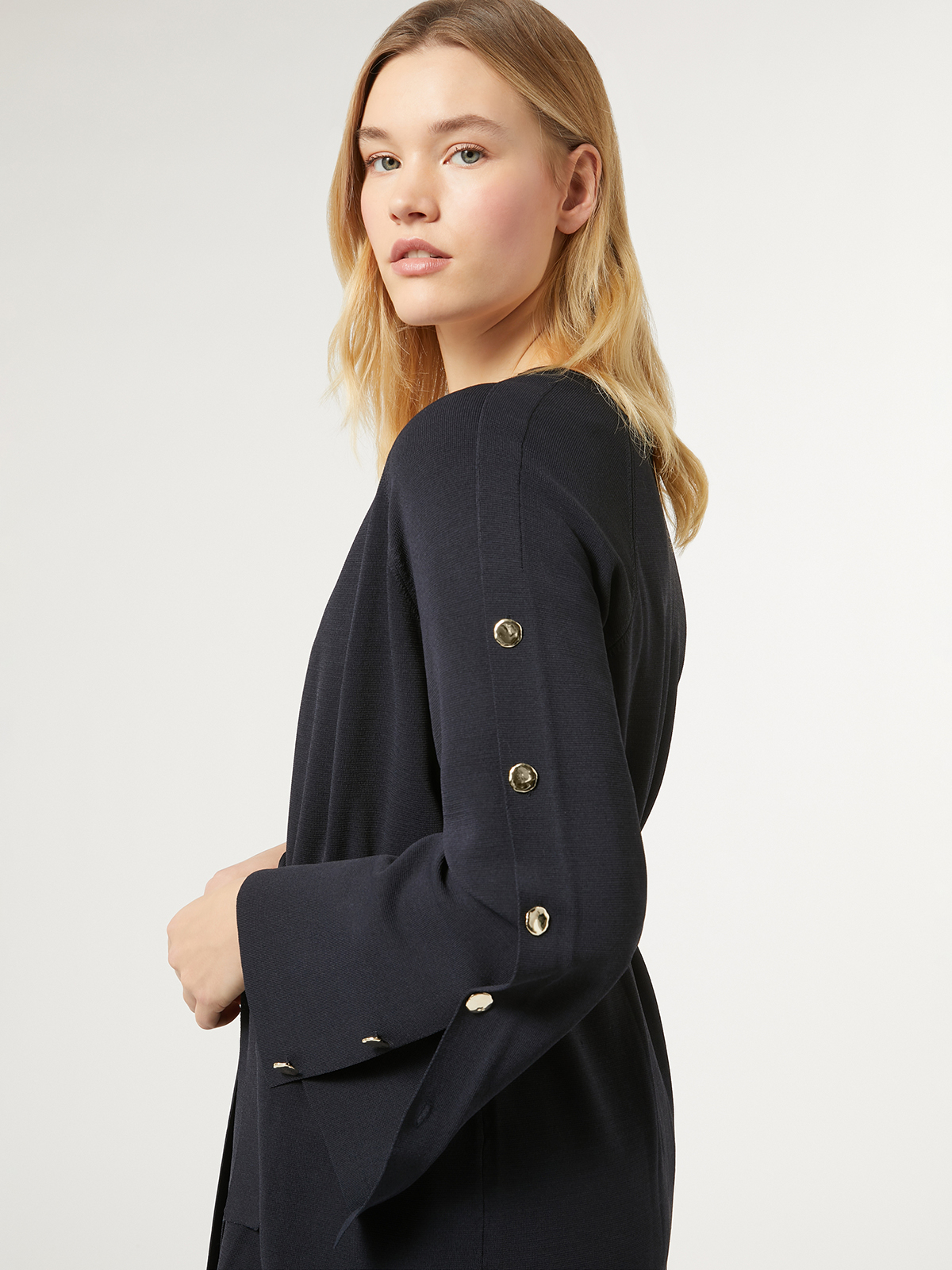 袖に並んだゴールドボタンが華やかさを引き立てるニットロングカーディガン。