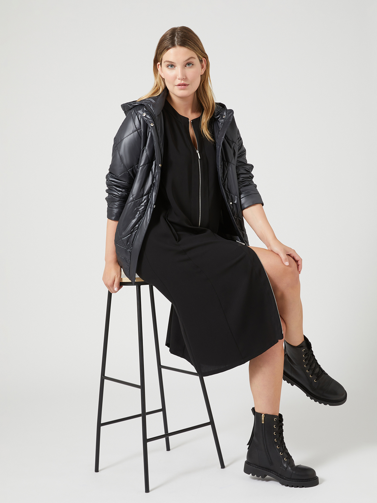 フロントジップやサイドの切り替えが縦のラインを強調し、綺麗なシルエットを魅せながらスタイルアップを演出します。