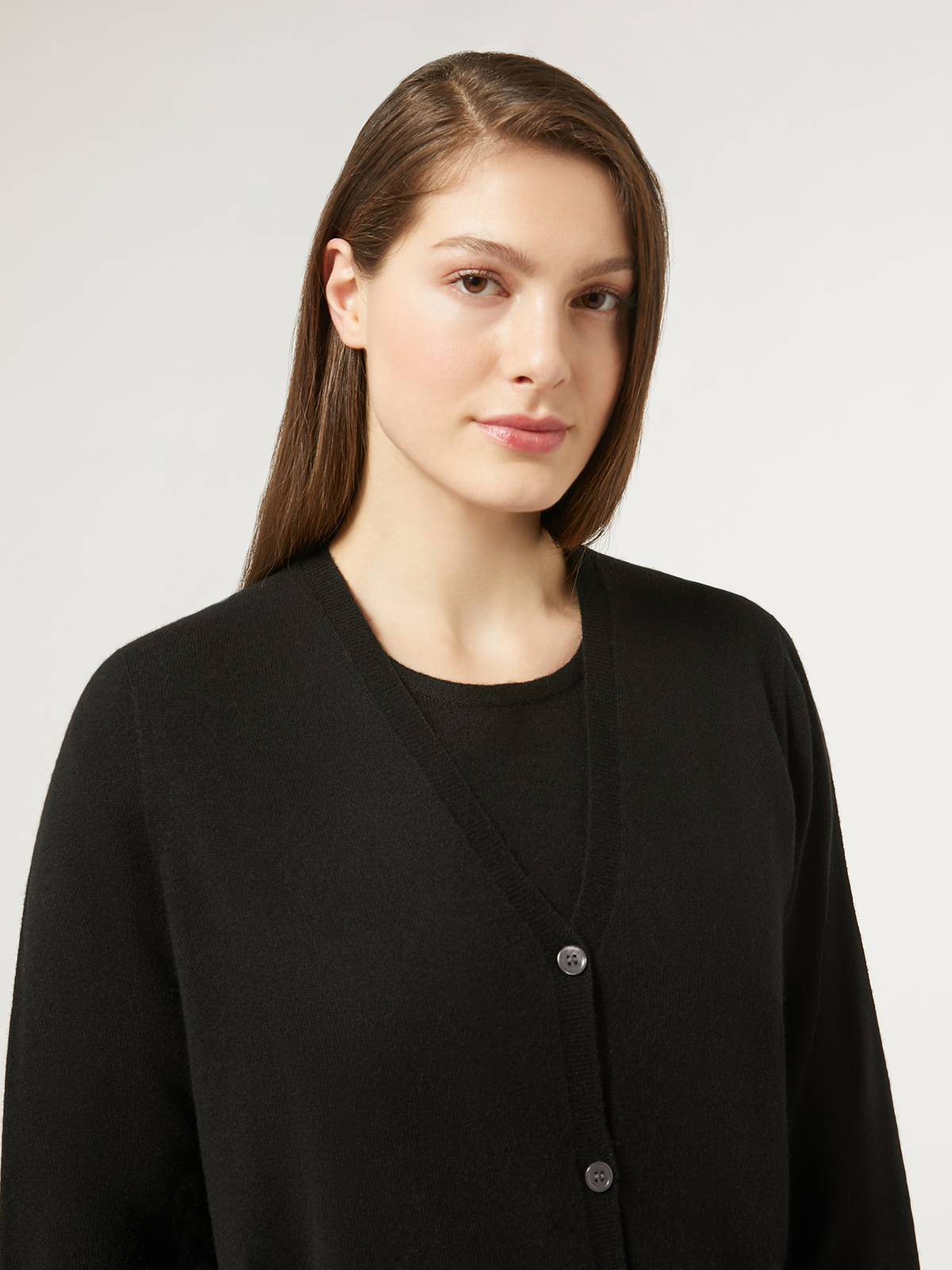 さっと羽織ったスタイルはもちろん、ボタンを閉めるとVネックのエレガントなシルエットに。