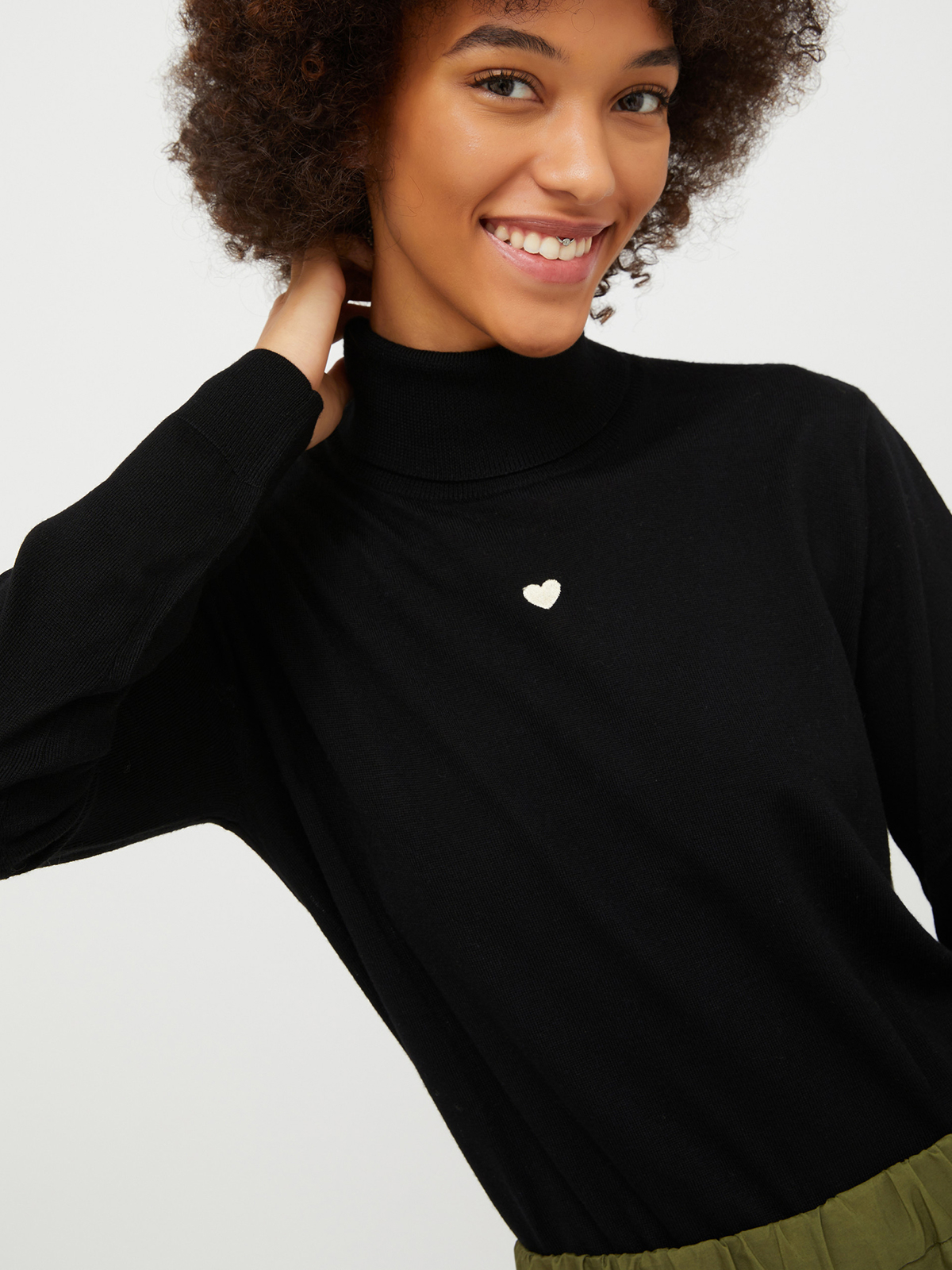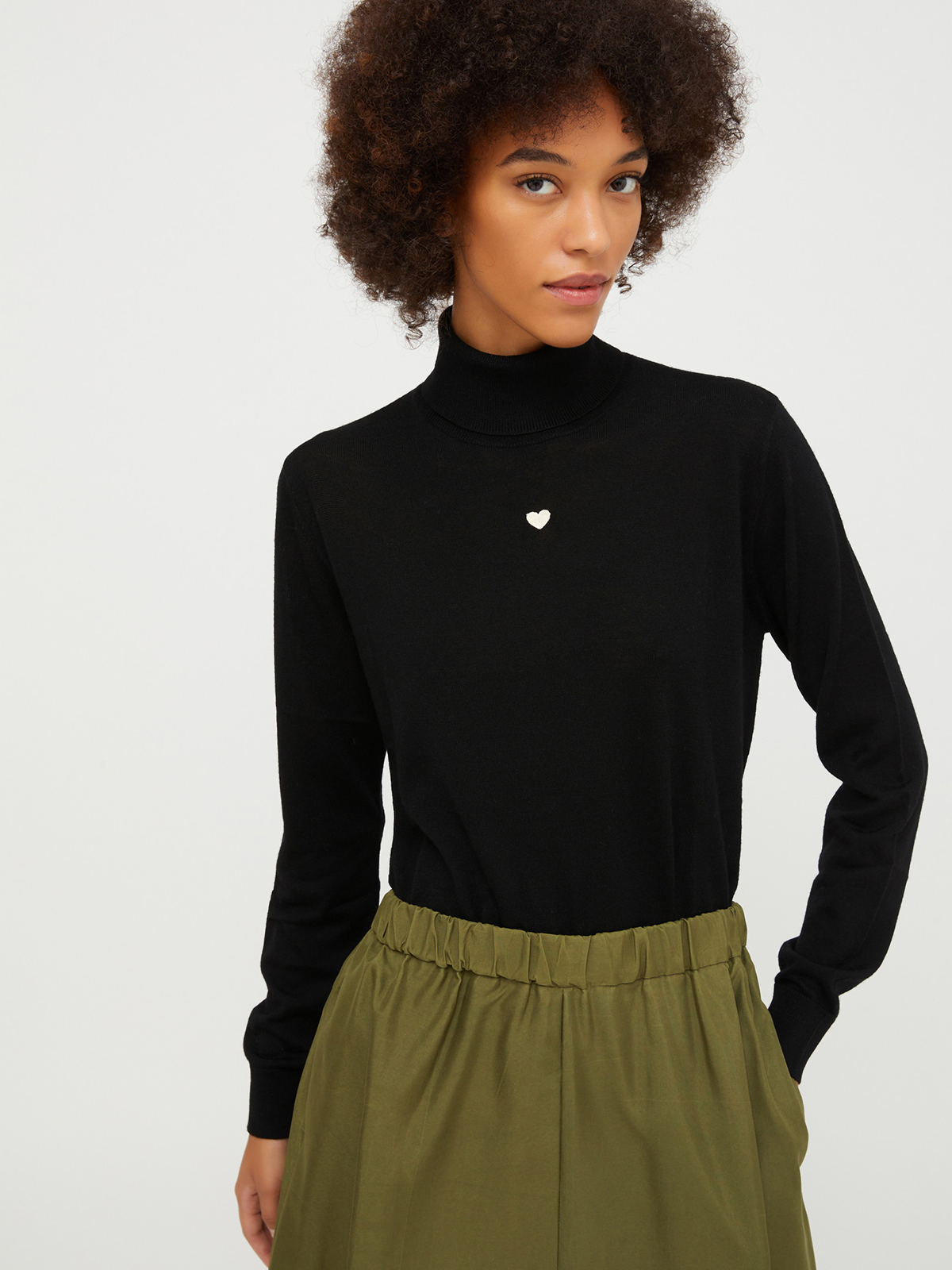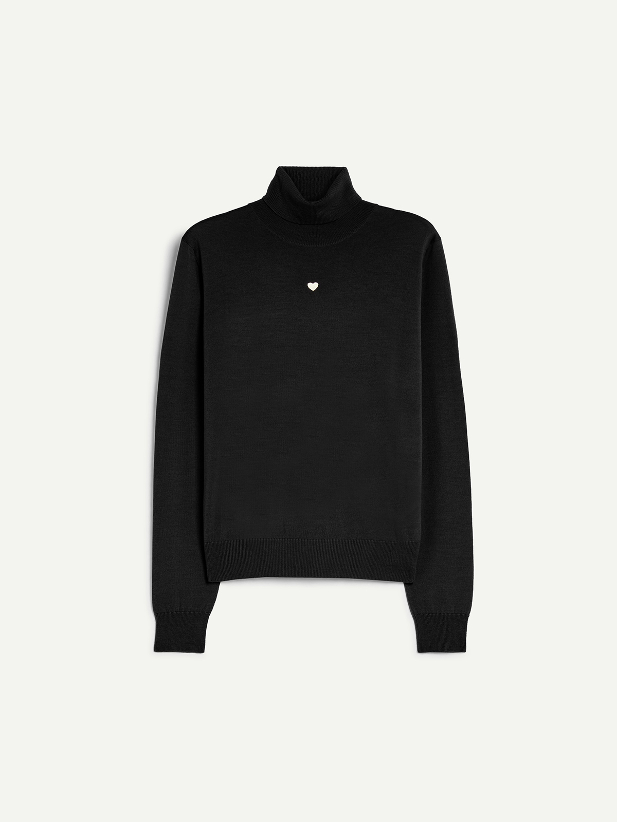 コントラストカラーのハートの刺繍が目を引くメリノウール タートルネック ニット。 暖かく軽量で、コンフォートな着心地に仕上げました。 袖口や裾にリブ編みのトリミングを施しアクセントをプラス。 ベーシックなシルエットなので、いつものスタイリングにプラスしやすく、冬のワードローブにおすすめです。 <ポケット>なし <スタイル>タートルネック