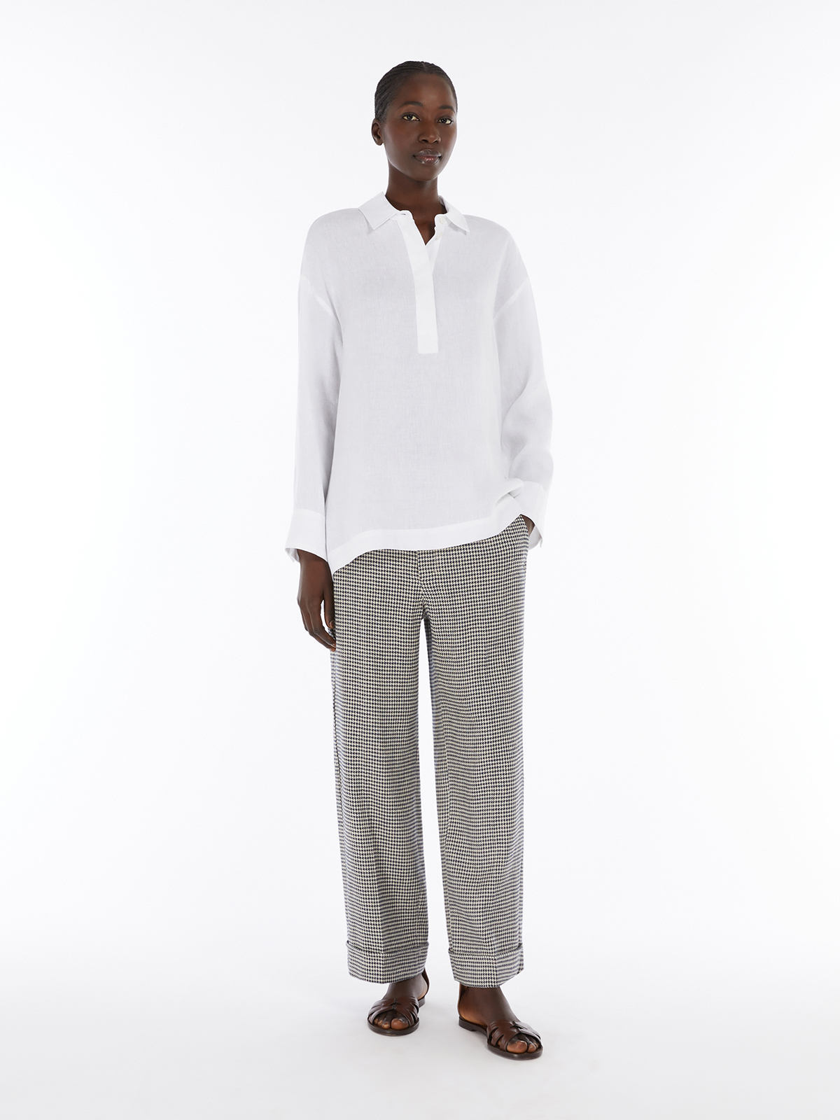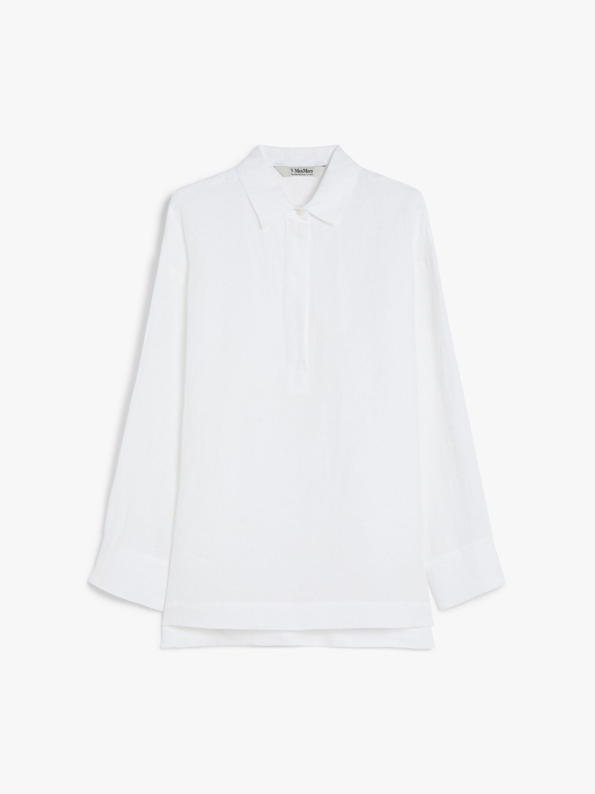 ポロシャツ風の襟が特徴的な長袖シャツ。 ウォッシュ加工を施したピュアリネンキャンバスを使用し、薄手で軽やかな着用感が魅力です。 シルエットはドロップショルダーのリラックスフィット。 裾はアシンメトリーで後ろがやや長くなっており、サイドにはスリットをあしらいました。 スカートからパンツまで幅広いアイテムと合わせて着こなしいただけます。 <ポケット>なし <スタイル>長袖