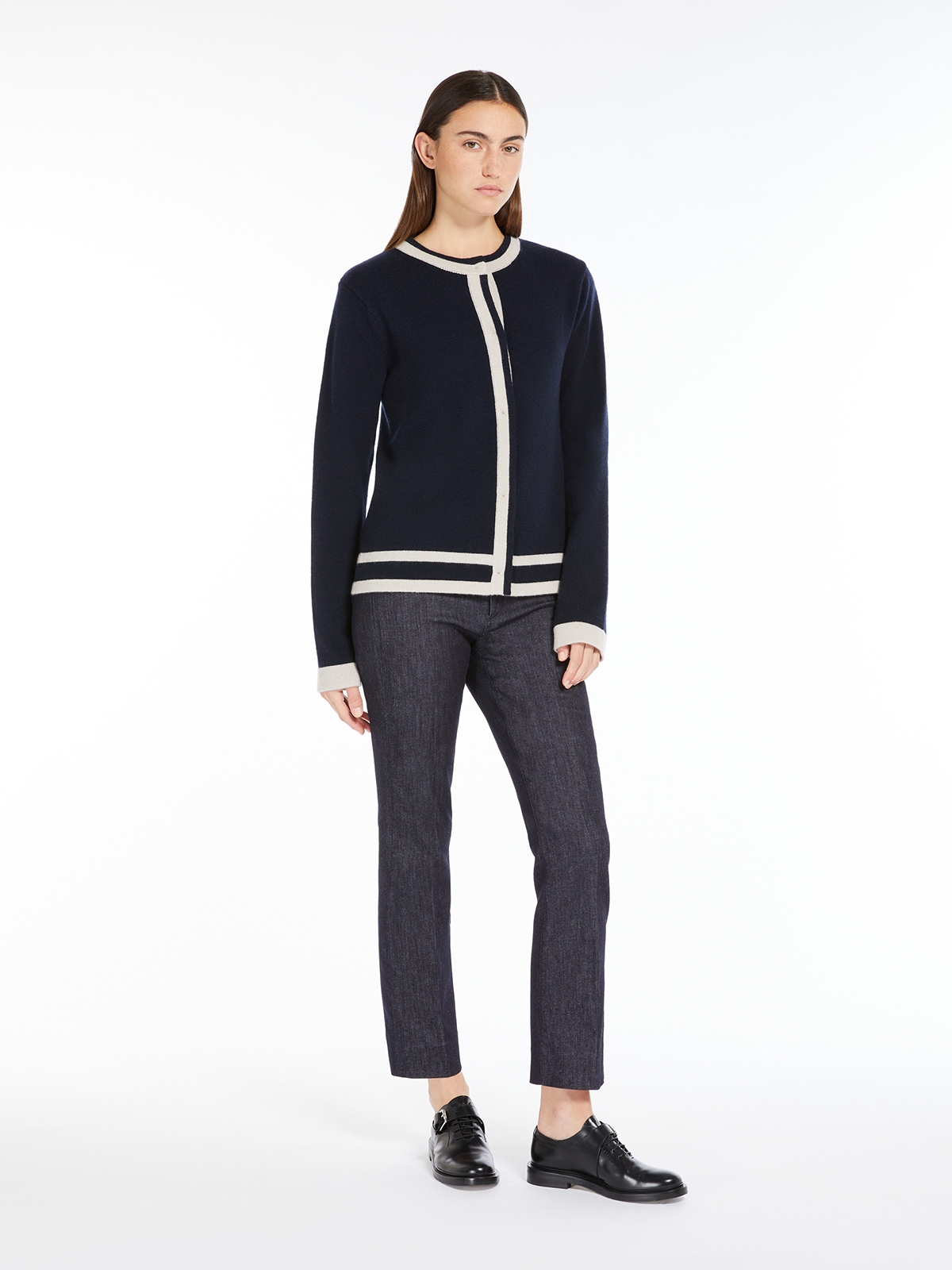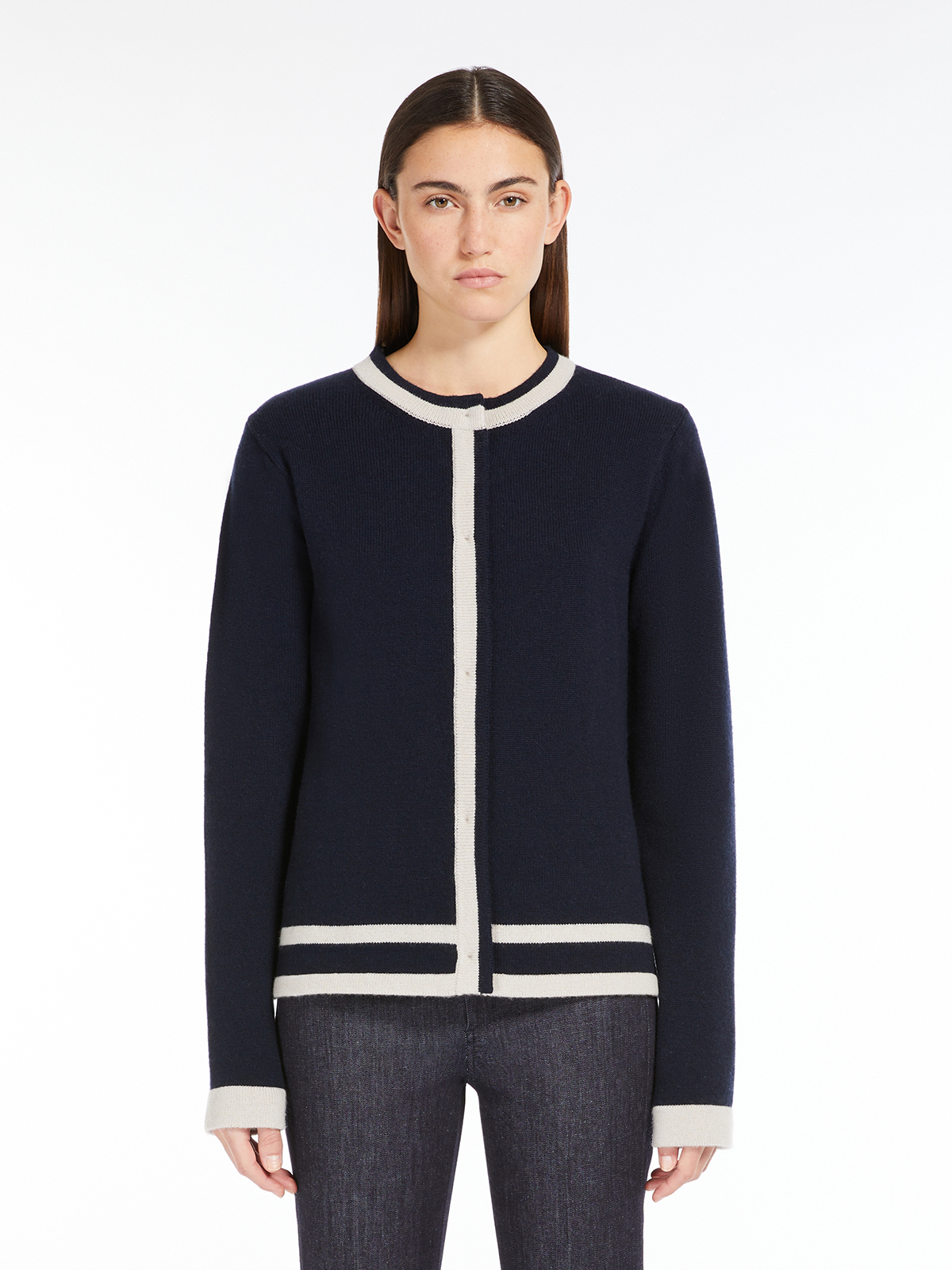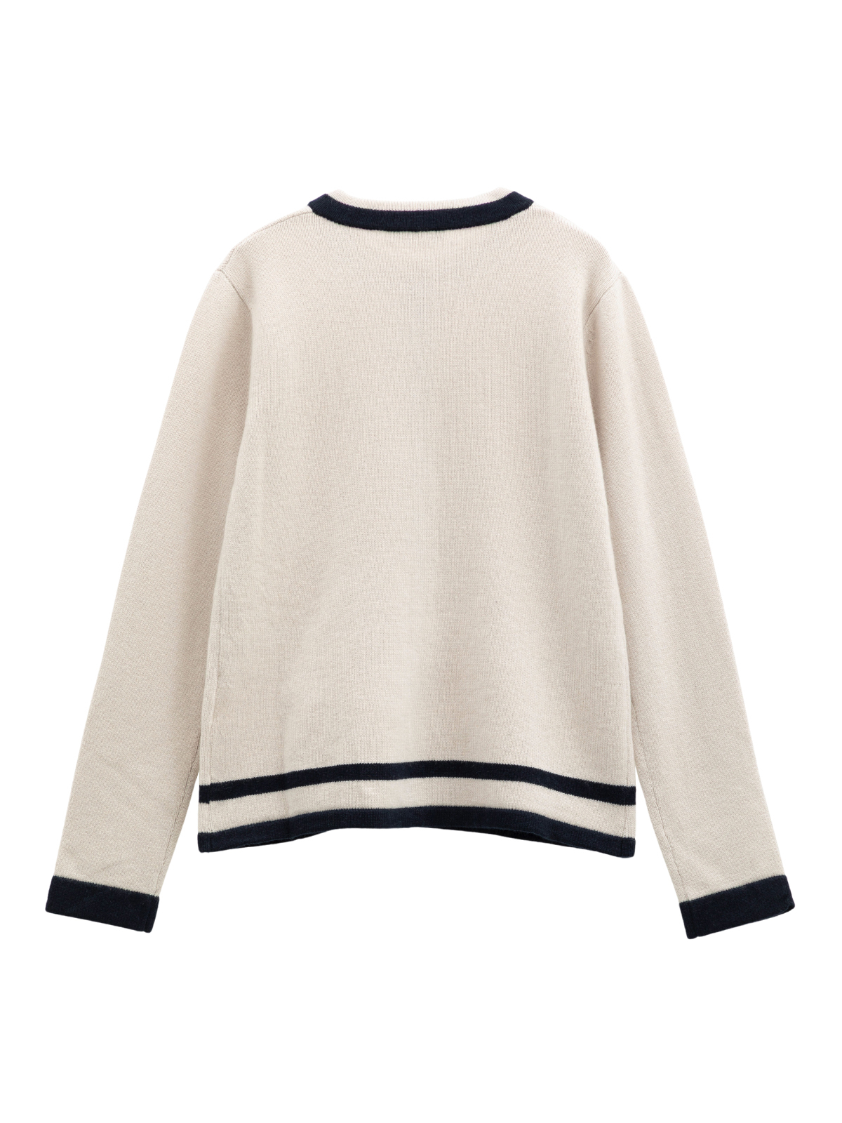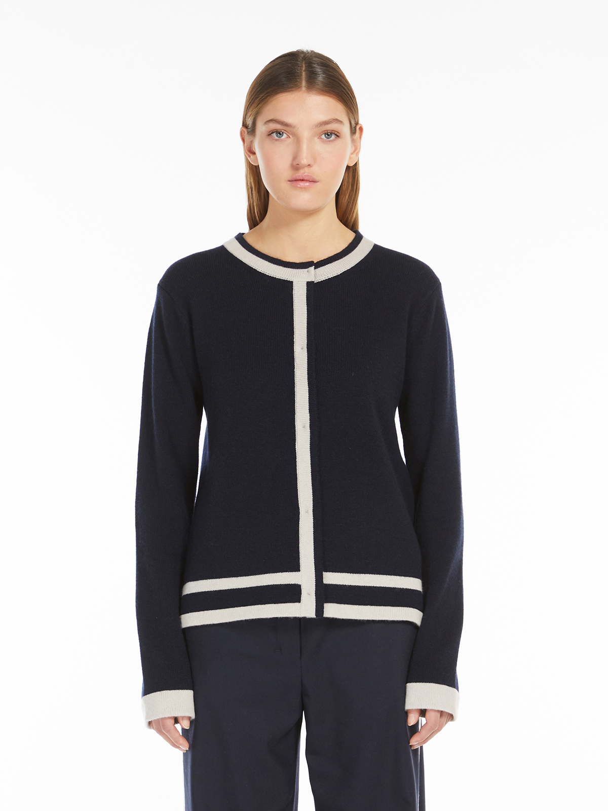 コントラストカラーのモチーフが目を引くカーディガン。 上質なウールとカシミヤがブレンドされたニットは、非常に肌触り良く、柔らかな質感が魅力です。 ラウンドネックのボクシーなストレートライン。 フロントボタンですっきりとしたシルエットに。 スカートにもパンツ合わせやすい着丈なので幅広いコーディネートを楽しんでいただけます。 <ポケット>なし <スタイル>フロントボタン留め