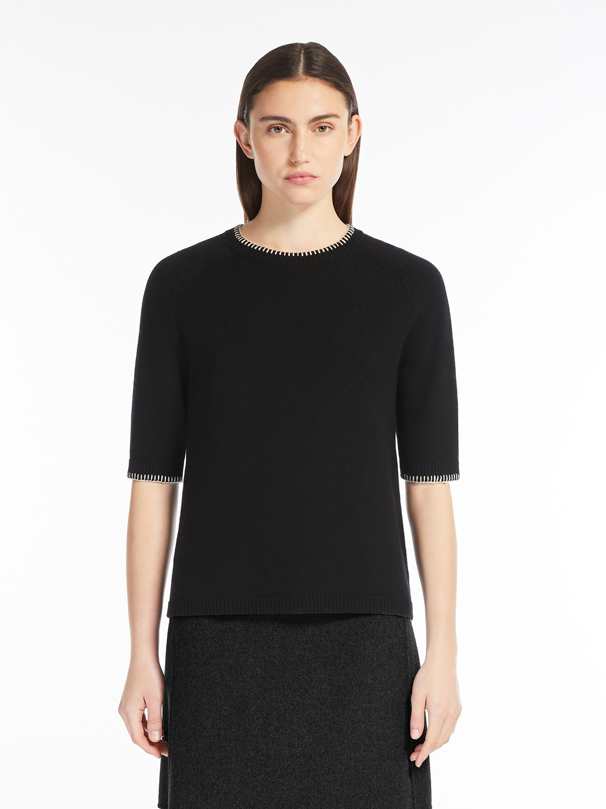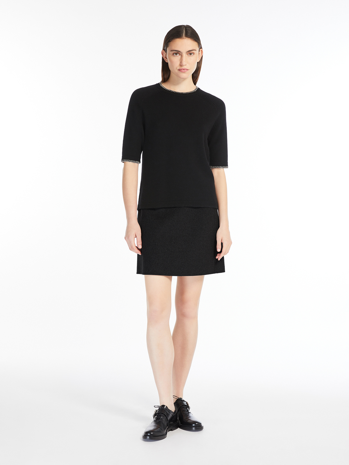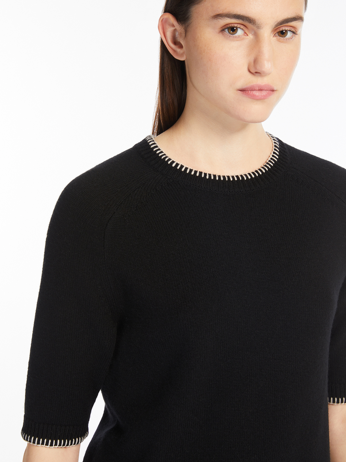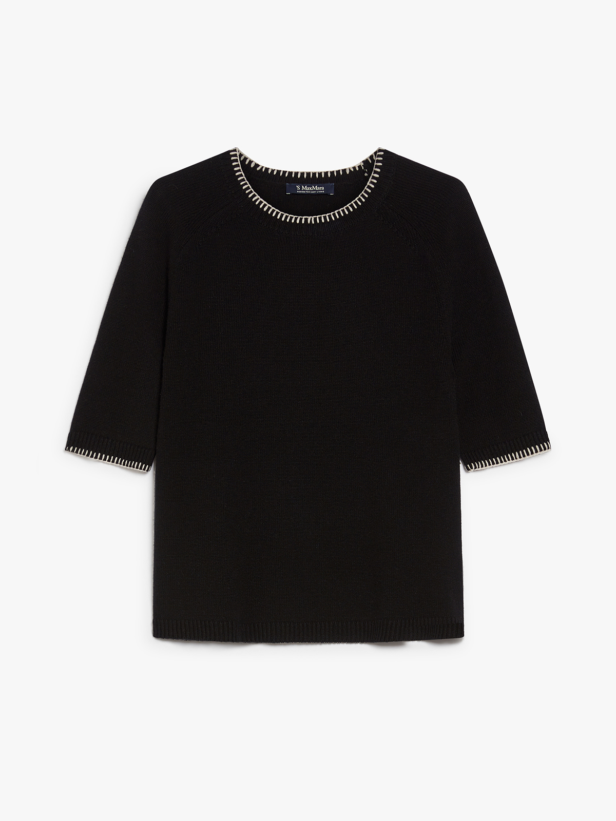 コントラストのあるブランケットステッチがあしらわれたニット。上質なウールとカシミヤを使用した生地は非常に肌触りがよく、柔らかな質感に仕上がっています。シルエットはクルーネック。短いラグランスリーブが特徴的。スカートにもパンツにも合わせやすい着丈で、様々なアイテムとコーディネートしやすい汎用性の高いモデルです。<ポケット>なし<スタイル>クルーネック